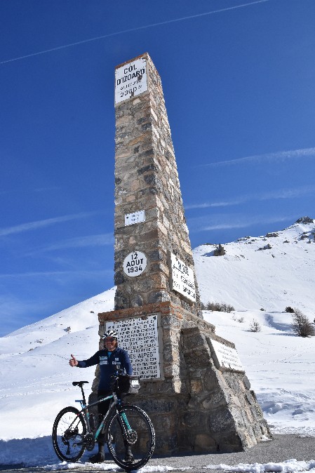 La strada che porta al Col d'Izoard è chiusa in inverno; la sua salita è stata resa possibile dalla presenza di una pista innevata che ricalcando la strada ha permesso al bcicloturista cuneese di raggiungere i 2371 metri, dove si erge il grande memoriale che ricorda coloro che hanno realizzato la strada nel lontano 1893.